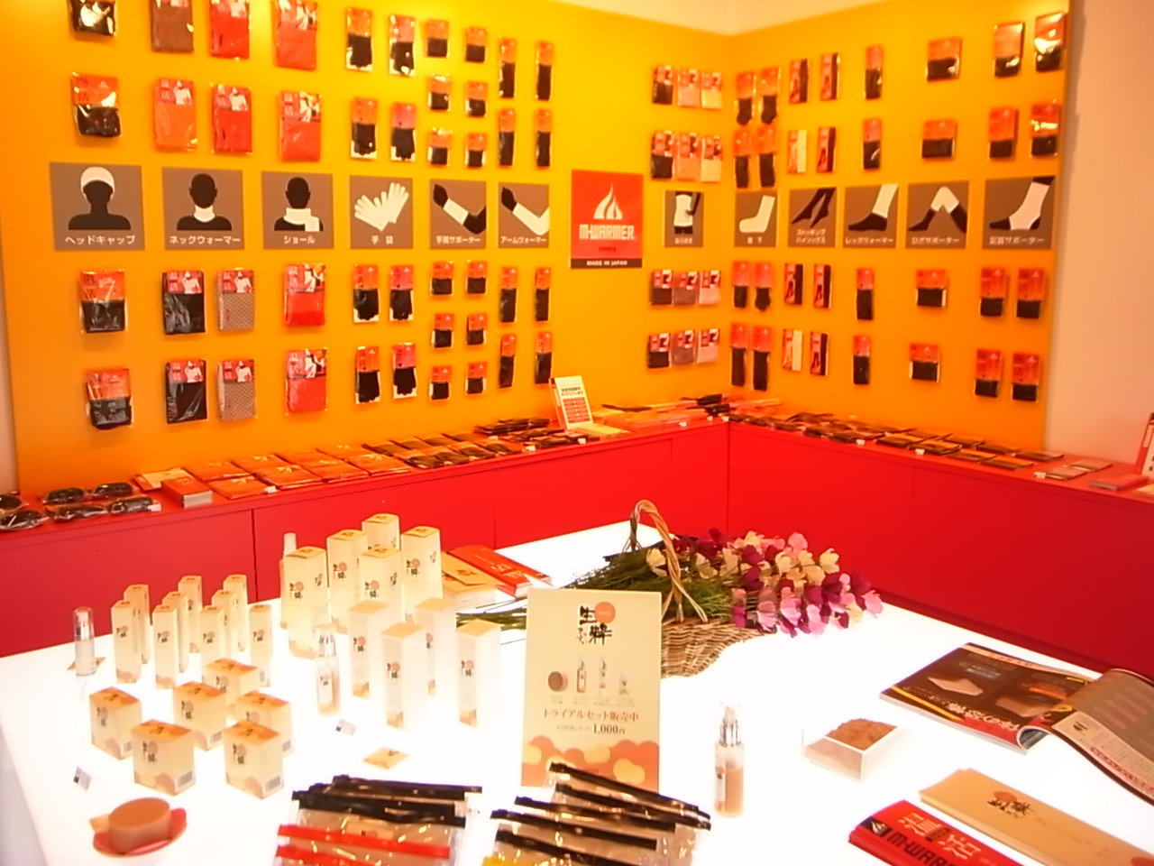 本日、『えひめイズム』に商品を納入しに行くと、店舗入り口が真っ赤に染まっていました。店内にも秋の雰囲気・・・あら?紅葉のディスプレイかと思ったら、それだけではありませんでした。ディスプレイの紅葉と合わせて赤の軍団が空間を支配していました。よく観ると、これは「マテラ」さんの『温活 エム・ウォーマー』の商品群の陳列ではないですか!赤い垂れ幕にディスプレイのブースを設営して力の入った展示となっております。前後して佐野勝久さん(エスデザイン・スタジオ)のブログを拝見すると、その様子がアップされていました。仕掛け人は佐野さんと大内智樹さん(パルス・デザイン)のお二人のお師匠さんでした。これだけ商品にバリエーションがあると、展示しても華がありますね~!羨ましい~。これだけの種類を作るのにはさぞご苦労があった事でしょう。