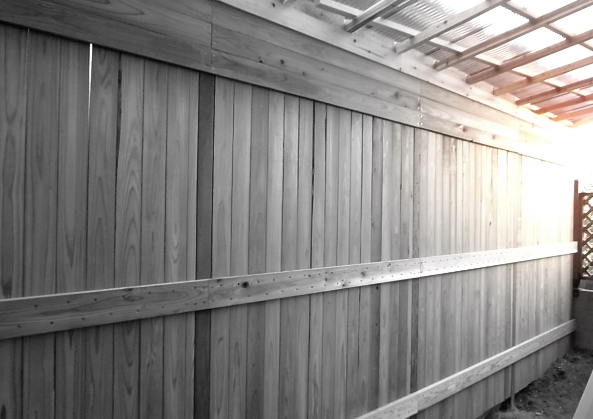 この板塀全体も1,2年もすればロマンスグレーに成長します。退色する事を極端に心配される方もいらっしゃいますが、どの段階が完成形なのかと考えるかによってその印象は随分変わってくると思います。左のモノクロで撮った雰囲気が、1、2年後のイメージに近いでしょうか。天然素材である木の宿命として、退色、色合いの変化は折り込み済みだと思うのは業者の思い込みかもしれませんが、辛抱強く説明していけばほとんどの方がしっかり理解してくださいます。『知るという事』は大切だと思います。