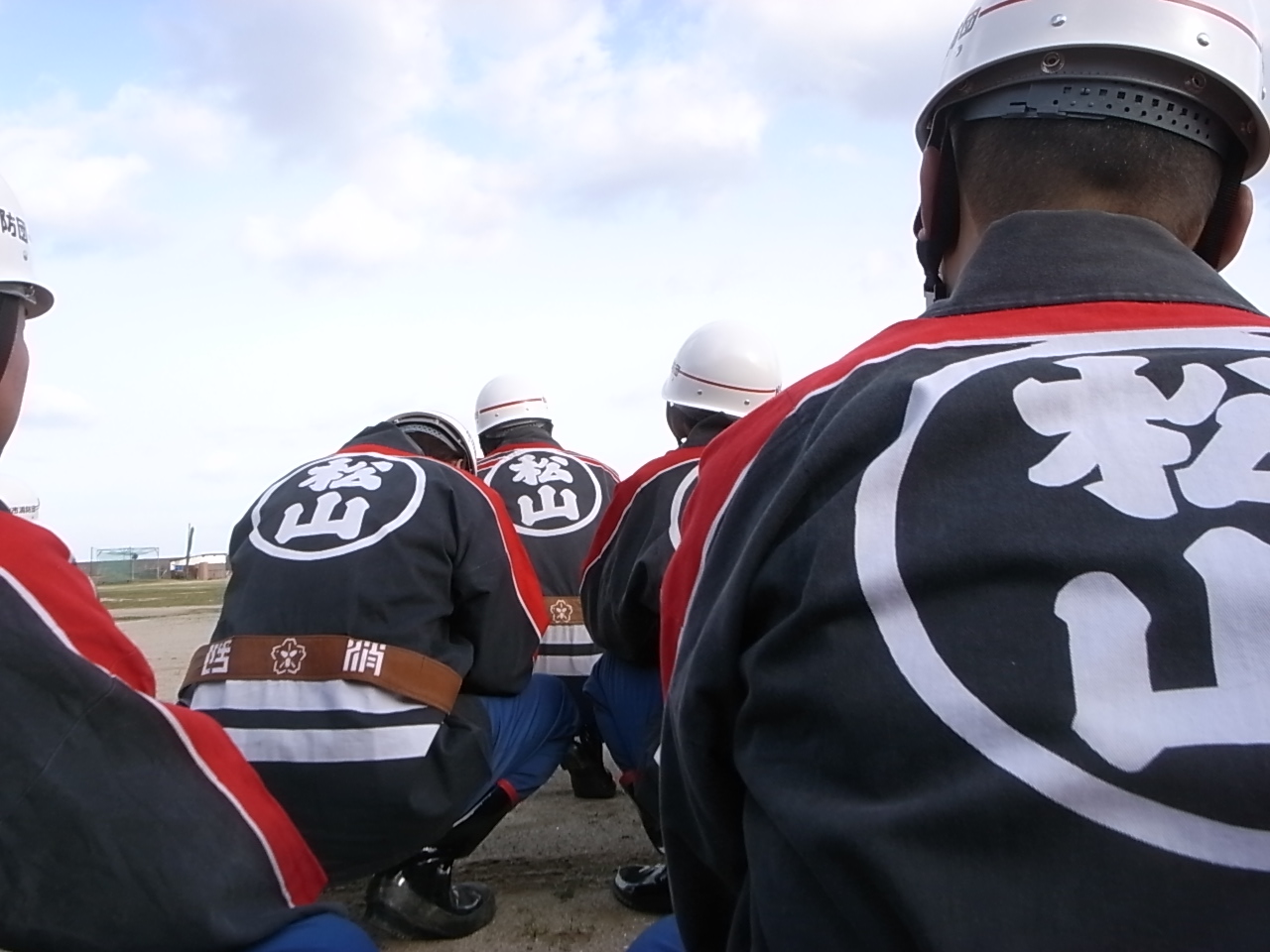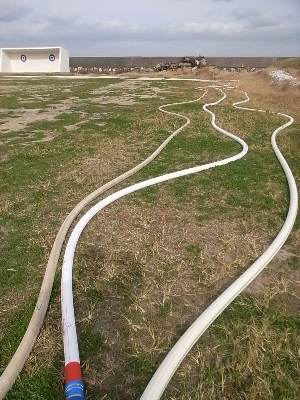 本日は、大五木材の敷地で『感謝祭』というイベントを開催しておりますが、私は朝から消防団の防災訓練に参加です。市内勝岡町のグランドに各分団が集合して、大規模災害のための防災訓練が実施されました。会場は海の近くで、風は冷たいものの、天気が良かったのは幸いです。こういう時は動いていた方が体が温まります。訓練はホースを50本繋いで、どれぐらいの圧が掛かるかを体験して、実際の災害時に備えようという事で、各分団手分けしてホースを連結していきます。グランドを3周分ホースがうねうねと繋がっている光景は何とも不思議なものです。これだけの長さを水が流れるのか疑問でしたが、水圧恐るべし!吸水のスイッチが入ると、まるで生き物のようにホースが躍動して水が走り出します。これが映画のような結構面白い動きです。ところが途中でホースに穴が幾つも開いてて、シャーッ・・・噴水が幾つも!