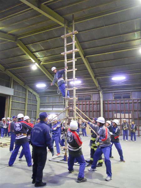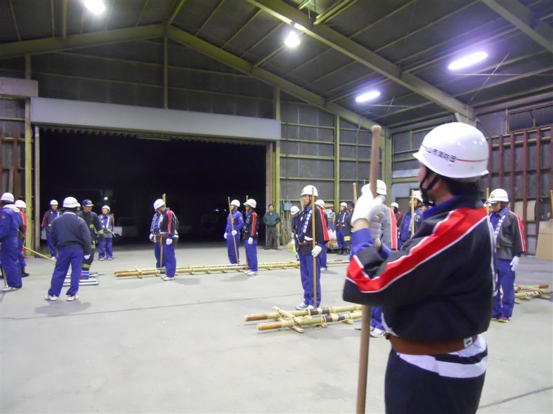 この竹梯子というのは、正式には古典竹梯子演技というものらしく、松山市の消防団が毎年順番に演技を披露しているものです。昨年までは、たいしたものだな~と感心しながらいいお客さんでいましたが、来年我が第一方面隊の潮見分団にもその順番が回ってきたのです。この演技は竹梯子を両側から担いで行うので、背丈のバランスが大切となるため、身長優先(?)で選手のひとりに選んでいただきました。なんにせよ、選出していただけるのはありがたい事です。お声を掛けていただくうちが花とも申しますので。