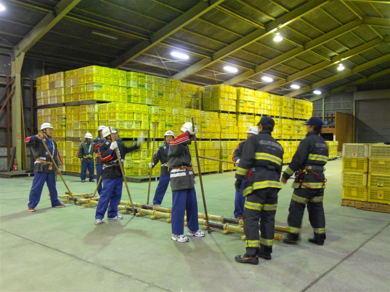 夜になると4分団の選手や関係者が、みかんに選果場に集合して、消防署員の方にご指導受けながらの訓練です。このあたりは宮内いよかんをはじめ、みかん栽培の盛んなところなので、各地区にこういう大きな共同選果樹場があります。うず高く積み上げられた黄色いキャリーケース(中は空)を煌煌と照らす水銀灯、夜の選果場に来る事は初めての経験でしたので、普段見ることのない異空間についついシャッターが進みます。初めて教わった時には、これは相当に時間を要する・・・と思ったものですが、こういうものは習うよりも慣れろです。