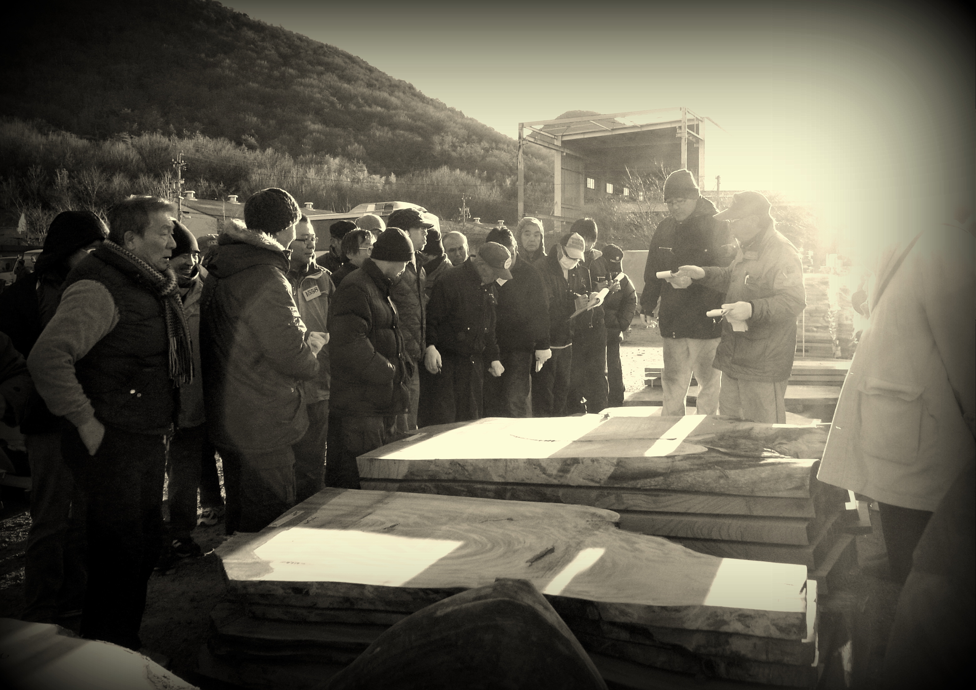 木材市の話の続きです。市の当日は早朝からのスタートで、そのスピードも速く、いちいち迷っていては勝負になりません。市というものは、とりあえずの大まかな相場といううものはあるものの、あくまでもその日の価格を決めるのは需要と供給のバランス。その日に、その材を欲しいと思う人が多く集まれば、必然的に競り上げられて相場以上の値段になってしまいすし、たまたまその材を狙っている人がいなければ、思惑以下の値段で仕入れる事も出来ます。それが市の醍醐味。