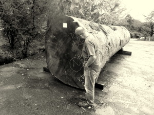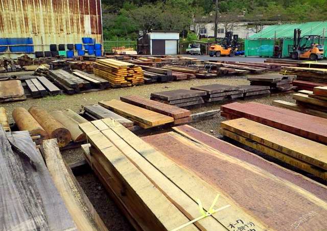 平野木材さんでは世界中からいろいろな樹種を集められているので、買う買わない別にその材を見たり触れたりする事が出来るので、私にとっては非常にありがたく貴重な場です。挽いた板材と合わせて、その板の元の姿である原木の競りも行われるため、土場には大きな原木も沢山横たわっていますが、板と原木『親子』の姿を同時に見る事が出来るのも大変ありがたく、『今日のかけら』で世界中の木の画像を集めているカメラ小僧としては桃源郷のような場所なのです。