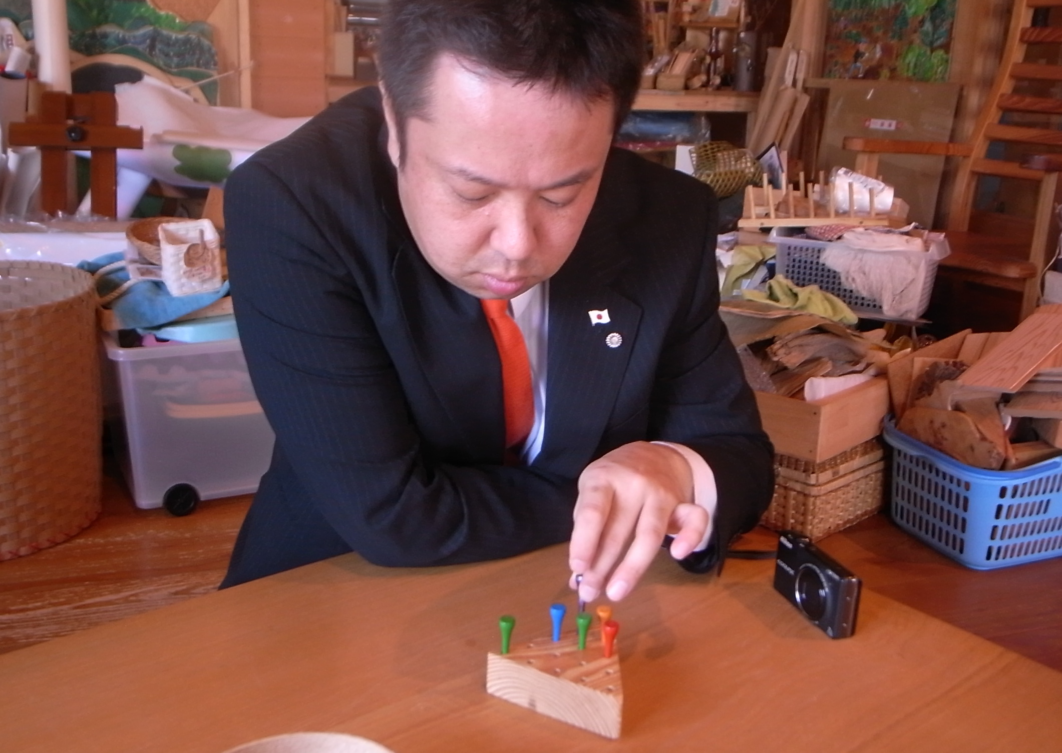 今年の6月に松山市で開催された日本木材青壮年団体連合会の全国会員大会で久しぶりにお会いして以来の再会ですが、不思議と奥さんは愛媛にご縁があって、今回で今年3回目の松山だという事。『ムー派』な私としては、こういうご縁っていうのは偶然とかではなくて、何か必然性があって引き付けられているのではないかと思うのです。事務所が大リフォーム中で片付けもままならない雑多な中で、まずは木のおもちゃで頭の体操に取り組んでいただきます。