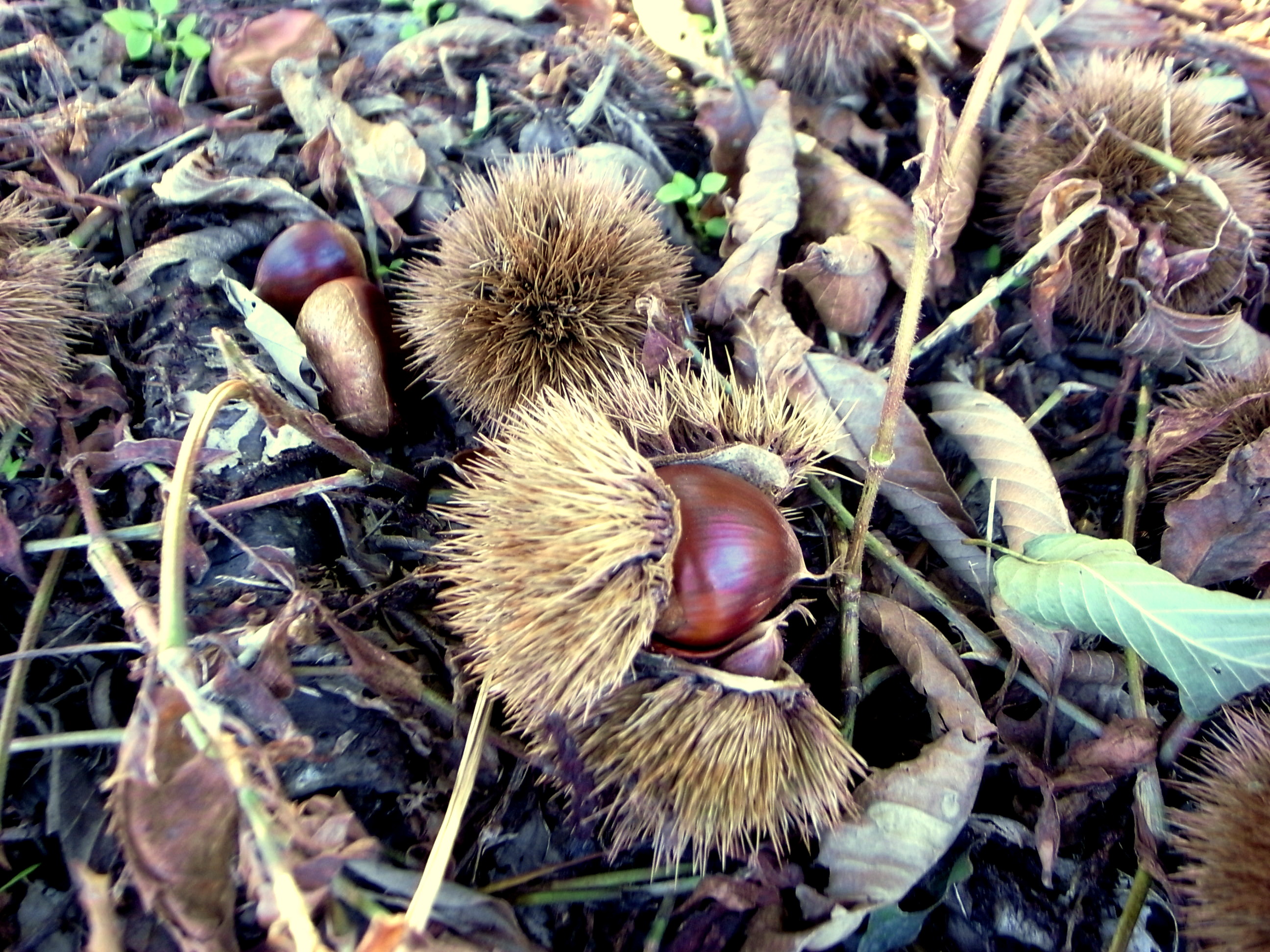 さあ、そんな前フリもあったところで、工房の中にお邪魔してポン菓子製造機の工程を見学。熱気のこもる室内で次々とパン豆が作られていくのですが、室内に充満するその甘い香りに我々の胃袋は刺激され、誰からともなく「試食とかはできたりしないんですよね〜?」の声があがる・・・。それでは折角なんで、この秋新発売の『焼きグリ』をこれから作ってみますので試食してみますか〜、何だか催促したようで。そういえば、工房の前にはクリの木があって足元には無数のクリが!