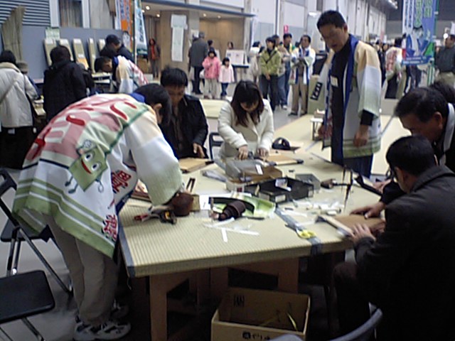 あらら・・・断水、いや『断ポン中』になってしまいました!茶目っ気抜群です。いいですね~!弊社の横のブースでは、愛媛県畳工業組合・松山支部さんがコーナーを出されていました。お知り合いの畳屋さんも数人いらっしゃいました。こちらも小さな畳を自分で作る体験コーナーが大人気で行列が出来ていました。