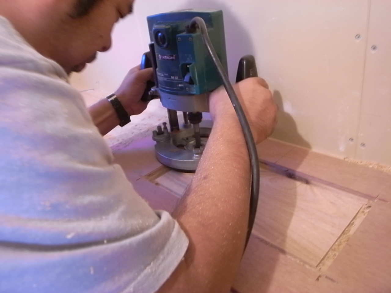 無事に想定通りの穴が開きました。 先日、樟に樟脳が含まれている話をアップしましたが、このカウンターは水廻りという事で、事前に弊社で全面ポリプレマー塗装をして固めています。ですので樟といえども全く匂いがしなくなっています。樟脳の香りも閉じ込めてしまいました。ところが、ルーターの刃先が入った瞬間、室内に物凄い樟脳香が噴き出しました!ポリプレマーで閉じ込められていた樟脳香が猛り狂ったかのように、狭い空間に一気に充満します。