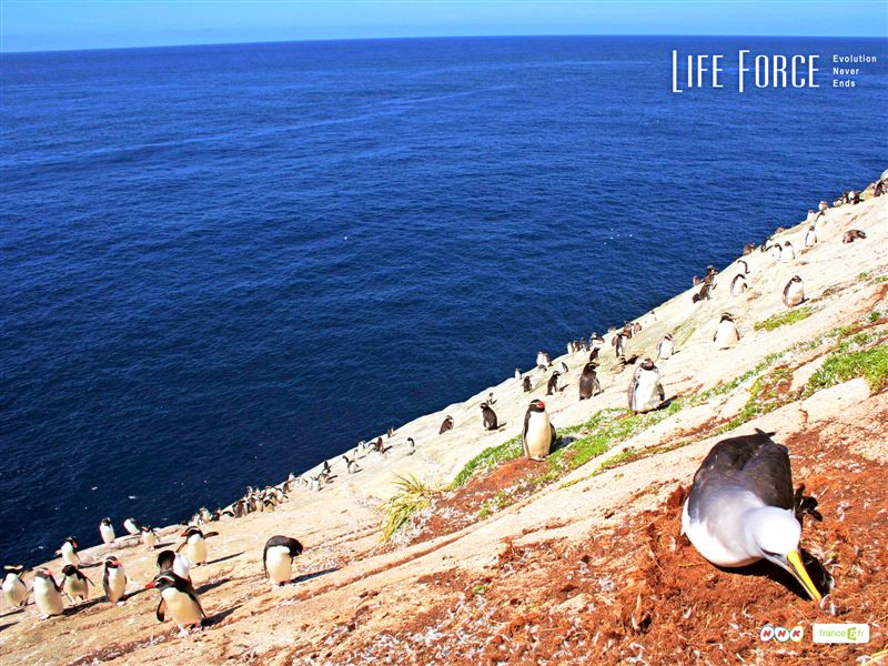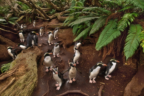 巨鳥モアは幻となりましたが、NZの独自の進化の一端として、今も島で繁殖するスネアーズペンギンの事が取り上げられていました。もともとペンギンの祖先は森で暮らしていたので、スネアーズペンギンはその名残をとどめていて、普段は森で暮らし、お腹が空くと海まで歩いて狩りに出掛けるのです。最強の猛禽類・ハーストイーグルに襲われていた遥かな記憶から、夜薄暗い中で彼らの心許ない森の行軍が始まります。