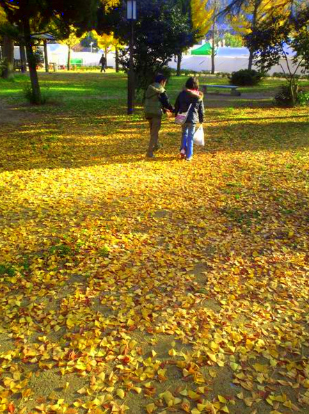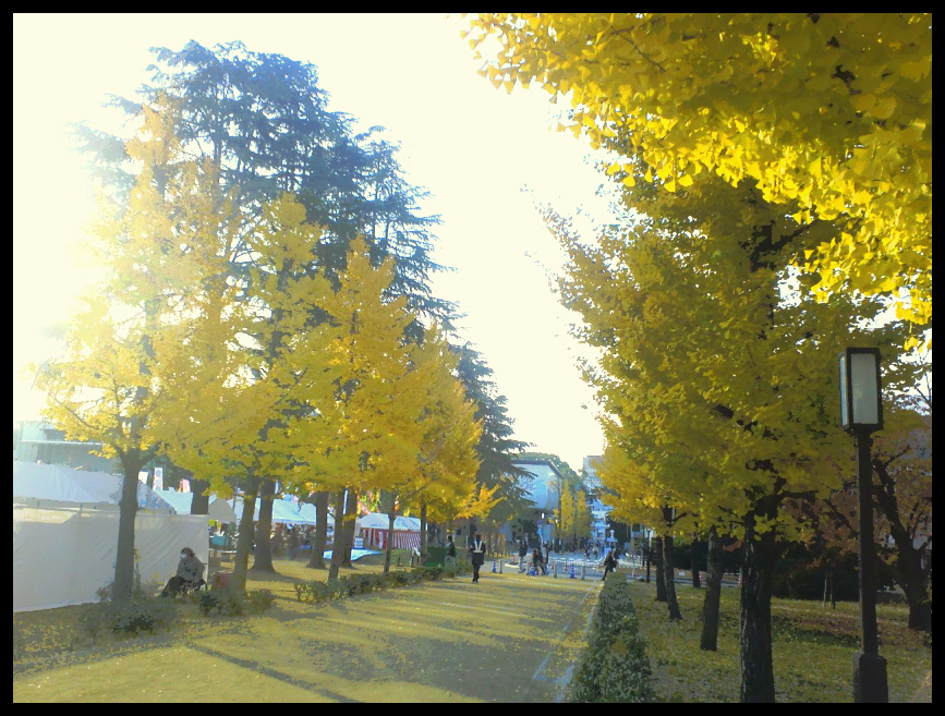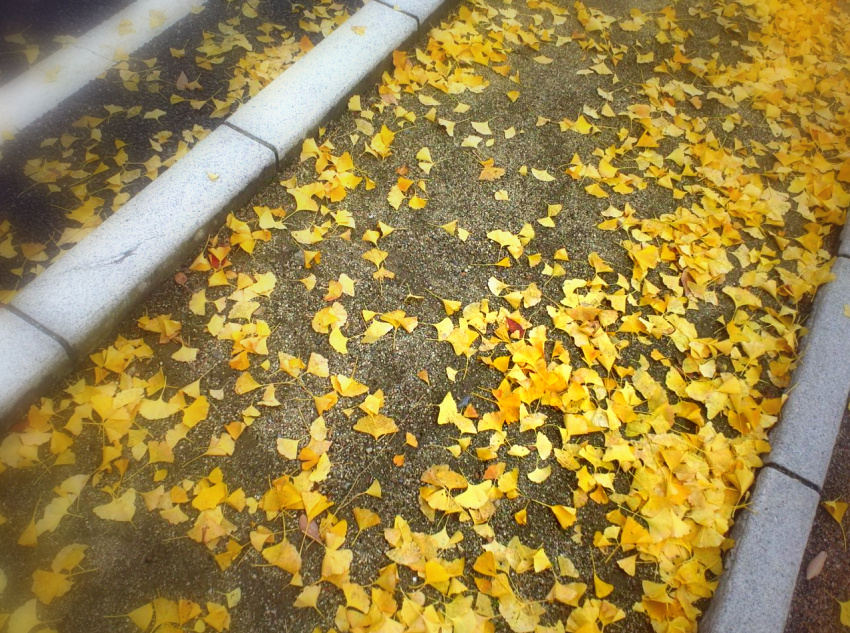 落葉した葉に混じって銀杏の実も沢山転がっています。沢山の足に踏みつけられ、銀杏独特の鼻をつく匂いも立ち込めます。この匂いがどうにもこうにも受け入れがたいという人もいらっしゃいますが、私は茶碗蒸しのギンナンや塩揚げも大好物ですので、まったく気にもなりません。さすがに転がっているいるギンナンを拾う方はいらっしゃいませんでしたが、これだけの鮮烈な「黄色」がそのままゴミになってしまうのは、毎年の事とはいえどうにもこうにもモッタイナイ・・・何とか活用できないものだろうか・・・。