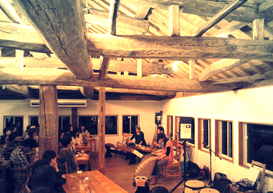 週末のコラボイベント『森のかけら音のかけら』を開催させていただいた双美町のカフェ「Ledru Rollin378」は、地区100年を超える古民家をリフォームされたそうで、初めて訪れると1階と2階の雰囲気のギャップに驚かれるでしょう。ゆうに1尺は越えるような梁が二重三重に木組みされ、その豪奢な造りは見る者を圧倒します。リフォーム以前は、この立派な木組みも天井の裏に隠れていたそうですが、これだけの木組みが見えるか見えないかで、室内のイメージはガラリと変わります。
