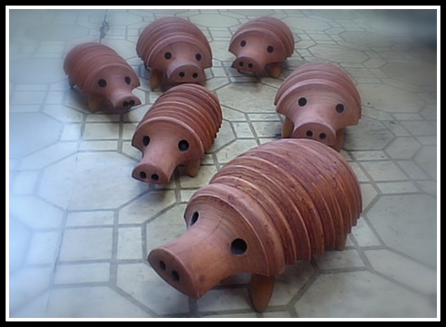 それでは、ここで『ブタマジロ』の事をおさらいしておきましょう!近年全国各地で、このブタマジロを河童やツチノコと見間違えたという目撃談が沢山寄せられています(トムももしや・・・?!)。このブタマジロは主に植林ヒノキ林に現れ、「フィトン、フィトン」と鳴きます。恐らく木材から発せられるフィトン・チットを懐かしんでいるのでしょう。いろいろな種類がありますが、柿渋色のものやまるでオスモカラーのスプルース色で塗ったとしか思えないものまでさまざま。親と子がいて、甲羅の形も鼻の長さも尻尾の有無や大きさも(生き物なんだから)当然さまざま。甲羅には他の獣と戦った名誉の負傷傷が、あたかも干割れのように見えることもあるとか。木材でいうところの「節」のような模様を持つものまでいて、地域によって独自の形に進化したのかも?このブタマジロに出会うと幸運を招くという言い伝えがあり、幻の珍獣を追い求める人は多い!
