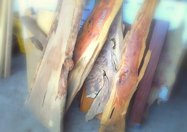 中身に何が入っているのかは、帳面上に控えてあるのですが、どういう木目だったかどういう質感だったかという事は忘れていることもあって、新鮮で得をしたような不思議な感覚になったりする事も!今回の梱包の中には、カイヅカイブキやシウリザクラ、イヌマキ、クスノキ、アカガシ、イチョウなどの変形した宮崎産の木々が数々現れました。形が形なので、買った当時の面白いと思ったものの、看板材ぐらいしか思いつかなかったので、後年の創造力に委ねる事にして倉庫の奥へしまったような・・・
