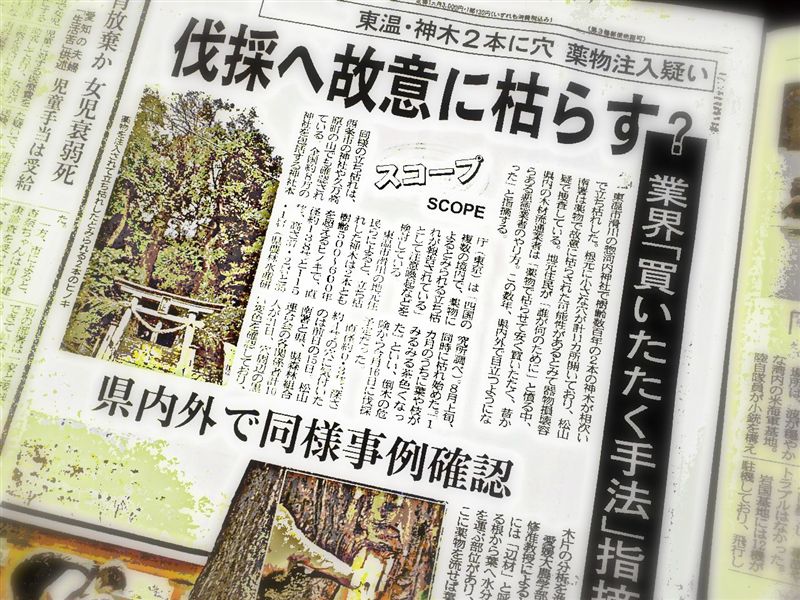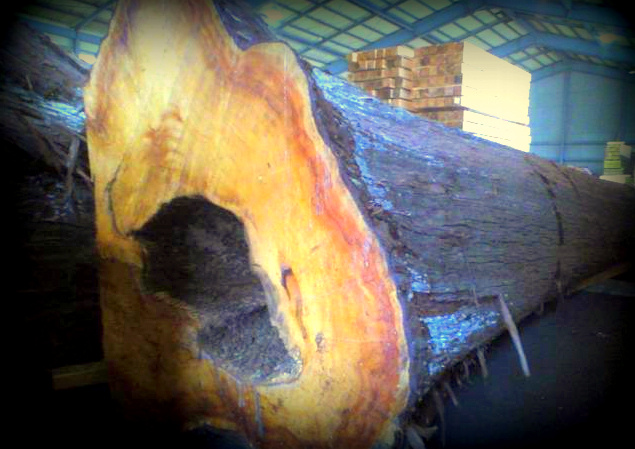 松山の場合、地元の製品市場に出品される樹種のほとんどは杉か桧で、弊社の得意な耳付きの多彩な広葉樹などの製品は滅多にお目にかかることはありません。そういう事もあって、市場に行くことが少なかったのですが、先日久し振りに市場に材を取りに行く機会があって、そこで目にしたのが例の桧の原木!そうです、昨年の秋にこのブログでも紹介した『ご神木への冒涜』事件ではからずもその「主役」となってしまったあの悲劇の6~700年生のご神木・桧。