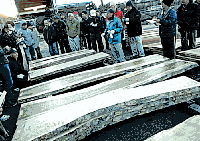倉庫の中にも多数の材が立てかけてあって、その間の狭い通路を買い方が押し合いへし合いせめぎ合うのです。たまたま相場伺いの私もその集団の最後尾にいると、その輪から少し離れた様子見の業界通っぽい方の話し声が聞こえてきました。「狭いから本気で買うやつしか近寄れん。この顔ぶれ見てみろ、そうそうたる連中ばっかりや。」後から聞けば、木材関係者ならば誰でも知っているであろうビッグネームの仕入れ担当の猛者たちがズラリと揃っておりました。