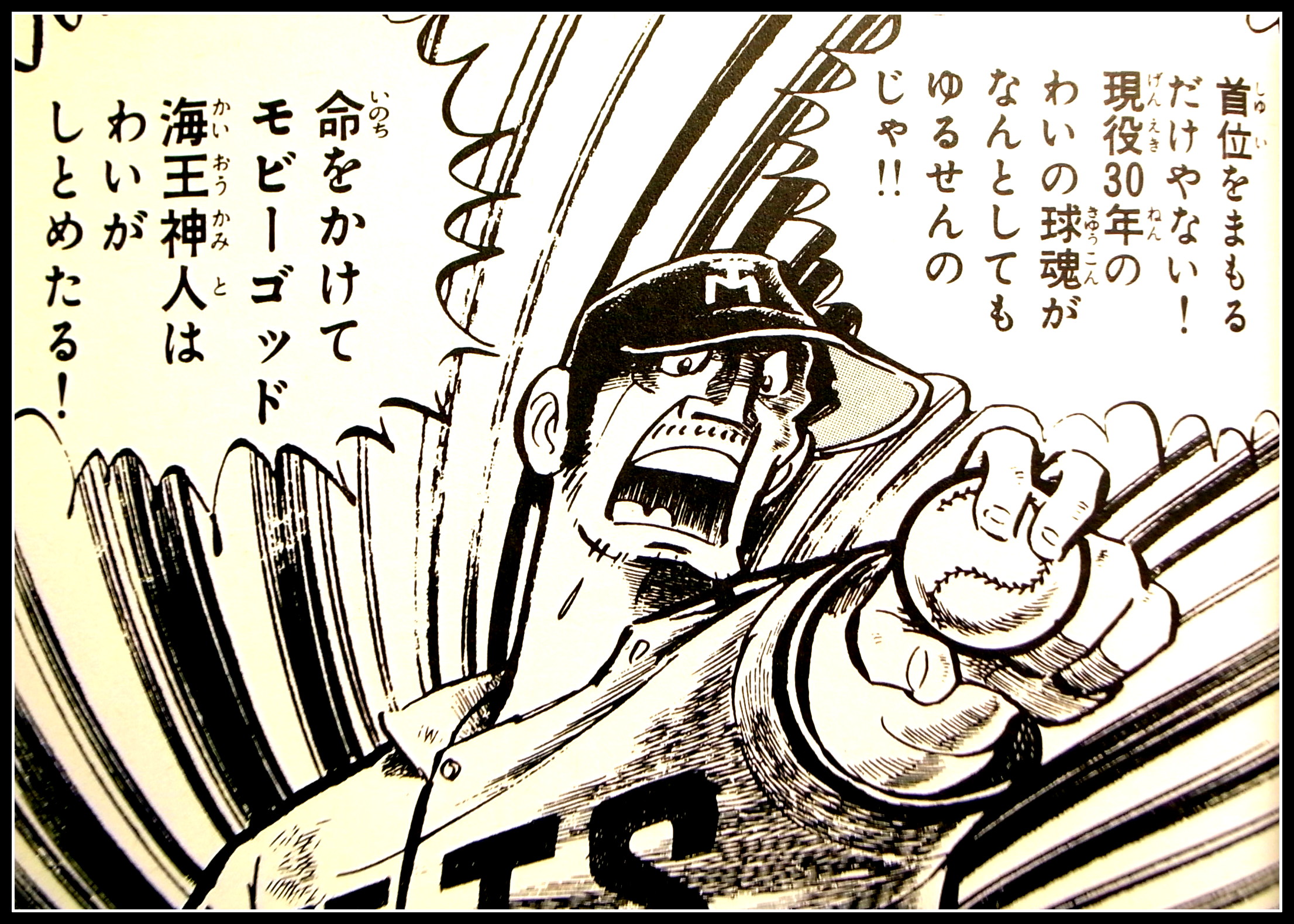 その巨大な暴れ鯨に対して、なんと海王は自らの手でモリを打ち込み仕留めるのです。そして、漁村に平和をもたらした海王は、大洋ホエールズに入団。翌日の甲子園での阪神戦に代打で登場し、超特大ホームランを放ち華々しいデビューを飾るのです。その凄まじい打棒は、セ・リーグの投手を次々と血祭りにあげて、いよいよ東京メッツとの戦いへ!その3連戦の1、2戦はメッツ投手陣は海王にまったく歯が立たず、敬遠のボールすら海王の見えざる力に吸い寄せられてスタンドまで運ばれてしまうのです