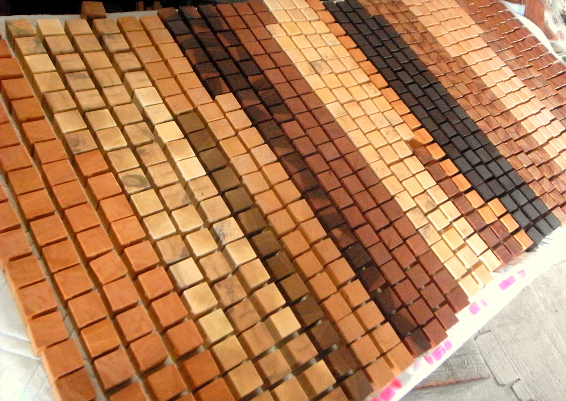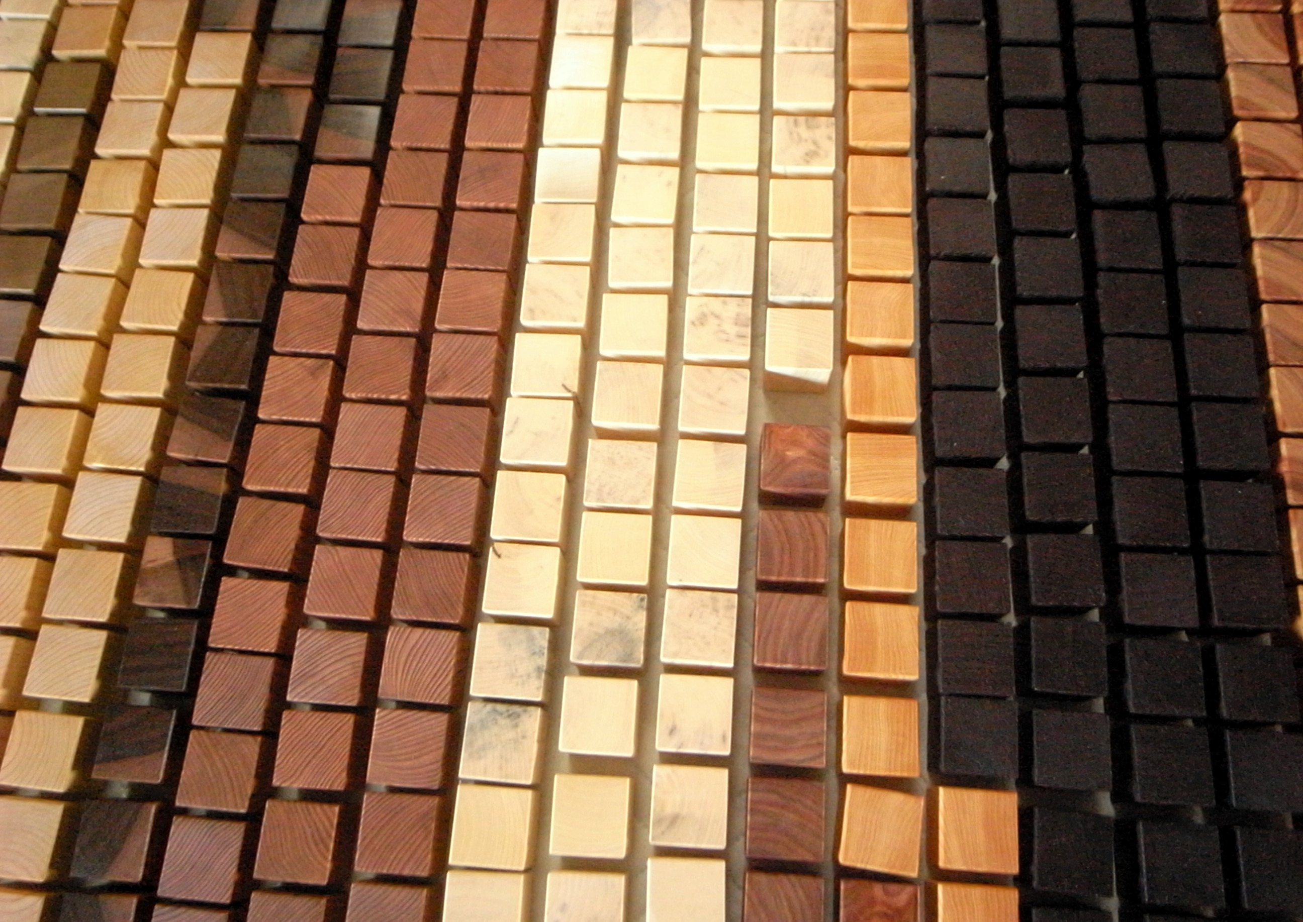 なんせ240種もあるので、なるべく特定種だけが偏ってしまわないように、追加加工する際は他樹種少量を心がけています。また、似たような色合いや特徴のモノはなるべくタイミングをずらすようにしています。40㎜サイズの荒材の段階では木目や全体の質感から違いがはっきり分かるものでも、35㎜角になってしまうと見極めるのは急激に難しくなります。見分けるのに無塗装の時とオイル塗装後の時では識別基準が変わってきます。前者は主に木目など後者は主に色合い。