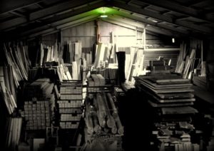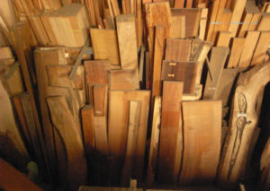 それから更に耳付き板の取り扱い量が増えてくると、お客さんに見せる意味も込めて倉庫の中に立てるようになりました。その頃はまだ売れるどうかもよく分からず、地元でも様々な広葉樹のしかもゲテモノのように思われてきた珍種やら変種を揃えていくことにスタッフからの理解も得られていなかったので避難轟々。しかし私はこの道を行くしか自分の生きる道をないとの確信もあったので、日々少しずつ独りで倉庫内のスペースを侵食していきながらひたすらその道を突き進みました。