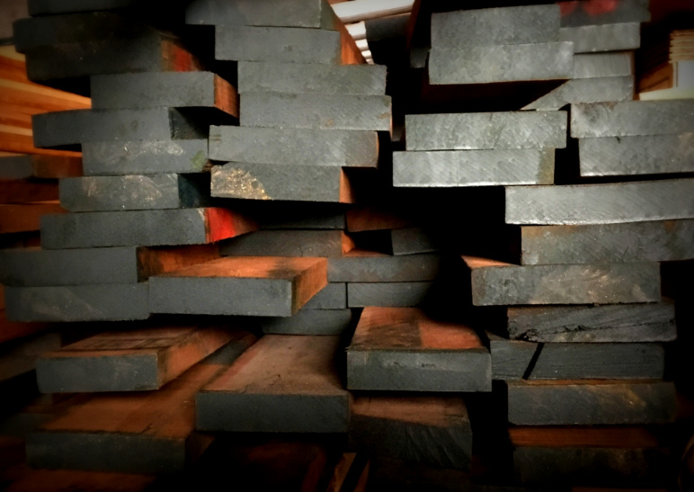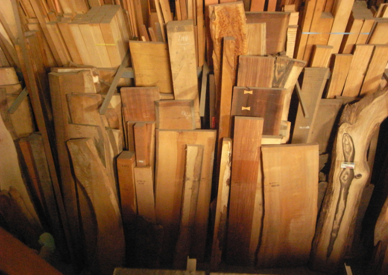 その頃、あまり大した展望も無くて、依頼された仕事のひとつとしてこなしていた家具の仕事が次第に舞い込むようになり、本格的に家具専用の木材を仕入れるようになりました。それまでは遠い存在であったブラック・ウォールナットやブラック・チェリーなどの北米材の平板が、増えてくると、材の搬出しやすい場所にということもあって次第にメインスペースの場所には、各国の広葉樹の平板が並ぶことに。黒、赤、茶、黄、白など荒材でもメリハリのある色彩が目に眩しかったものです。