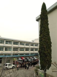 イトスギといっても一般的にはあまり聞き慣れない名前だと思います。ところが私をはじめここ周辺にお住いの人には親しみのある木なのです。というのも、子供たちの通った潮見小学校の校庭には大きなイトスギが植えられていて、学校のシンボルとなっているからです。生徒はもとより、学校を訪れる人は必ず目にするであろうイトスギは、1963年に潮見小学校が青少年赤十字(JRC)に加盟した事を記念して植えられたそうで、詳しくは以前にこちらのブログで書きました。