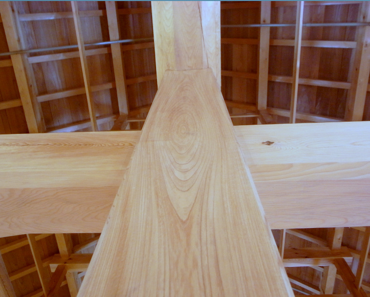 城のような、ある意味木材にとって王道ともいうべき用途を見れば見るほどにますます、そっちの思いが強くなる天邪鬼的性格。ところで城といえば、愛媛でもおよそ3年をかけて平成16年に大洲城の天守が復元されましたが、使用された木材の総量は450㎥(ちなみに金沢城は1,000㎥)、木材費用は13億円、延べ床面積は140坪。重層を支える梁は110本に及び、丸太の直径は3尺近いモノを使ったそうですが、さすがにそれだけの巨木となると地元だけでは調達できず、木曽ヒノキが使われました。 |