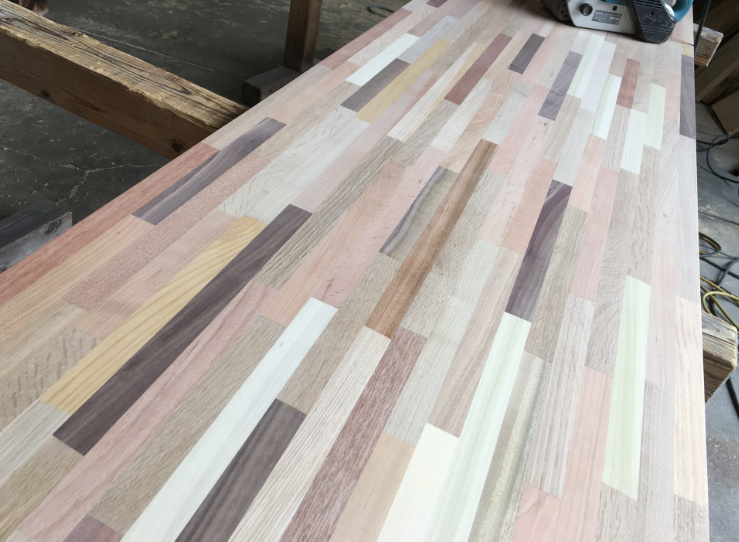 | 弊社で制作している『モザイクボード』の納品先は、圧倒的に県外が多いのですが(主に関東、東海、近畿方面)、県内からも時々お声がかかります。その場合は工務店さんからの注文というよりも、施主さんからの直接の問い合わせがほとんどです。今回も市内の方からご注文をいただき、出荷準備の作業をしています。モザイクボードは、10数種の樹種が混在する多樹種積層フリーボードで、基本サイズは3000✕600✕30㎜と2000✕500✕30㎜の2種類で、無塗装品の状態で弊社に保管してあります。 | ![]() |