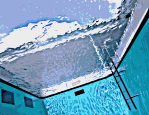 | この後、福井県に移動するというタイトなスケジュールでしたので、開館前に来たものの、既に入口には長蛇の列!金沢城、兼六園と目と鼻の先という立地の良さから観光コースにも組み込まれているようです。まずは『21世紀近代美術館』の中でももっとも有名な作品のひとつが、この『スイミング・プール』。アルゼンチン生まれの芸術家レアンドロ・エルリッヒ氏の作品で、恒久展示となっていて撮影も自由という、とっても分かりやすいアートです。館の中庭に設置された変哲のないプールなのですが、地下に行ってビックリという仕掛け。 | ![]() |