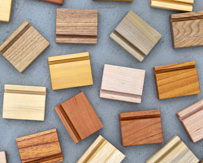 | 昨年ご縁をいただいて現在も取り組まさせていただいているのがこちら。名刺の半分ぐらいの小さな四角い木片。片面には斜めのスリットが入っています。これが何かというと、卓上カレンダーを立てかけるためのスタンドです。東京都江東区に本社を置く株式会社TOLOTさんが制作されている卓上カレンダーの付属品で、昨年よりご注文をいただき弊社で制作させていただいています。期間限定の商品でないので、年間通じてずっと作らせていただいていて、『端材の王国』としては実にありがたいご縁なのです! | ![]() |