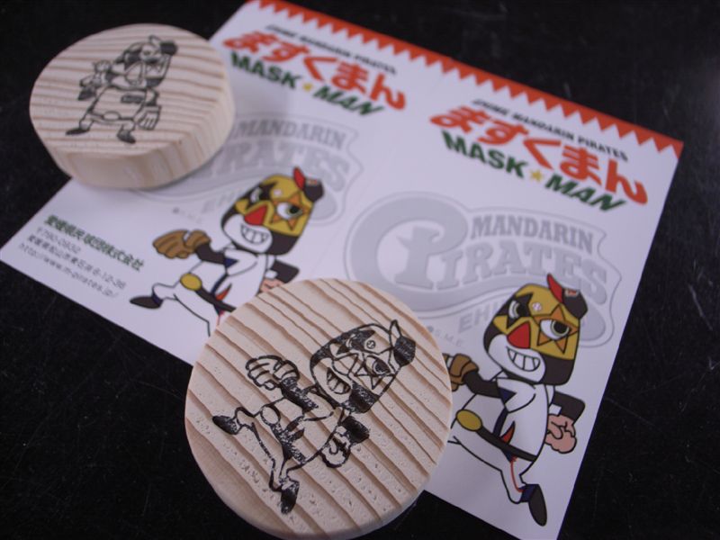 20120530 4あれから再びご縁に恵まれ、球団の方とお話しする機会に恵まれました。強く願えば望みは必ず叶うものです!そこでご提案させていただいたのが、こちらの『森のしるし・ますくまん篇』です!人気のますくまんを愛媛県内産の『樅(モミ』の木にスタンプしました。本当は、試合で折れたバットから作りたかったのですが、実際に折れたバットを見せてもらうと、かなり破損がひどくて加工できる形状が限定されます。それで今回は県産の樅を使い、年輪を横向きにして躍動感を表現してみました。