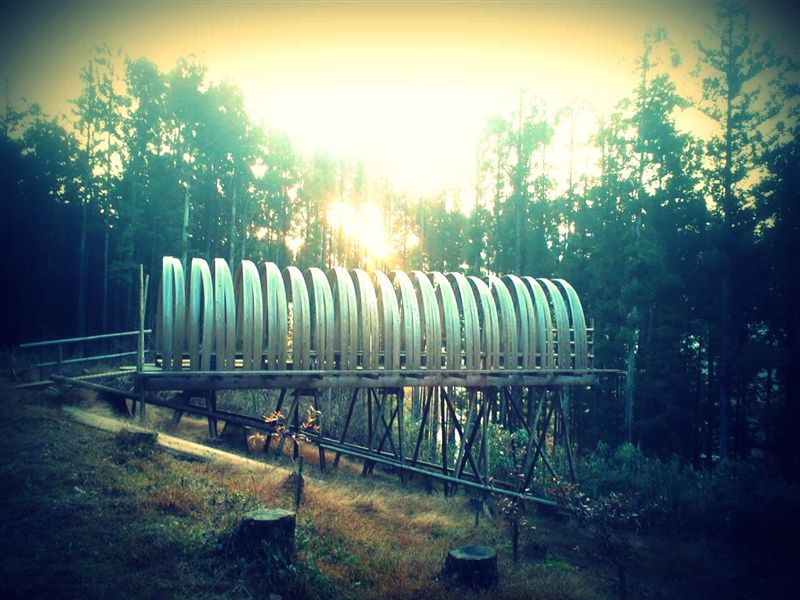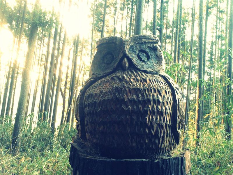 さて、その砦を抜けて『木のトンネル』へ続く坂道を登っていくと、そこには「関所」があって、森の番人(番鳥)が貫禄たっぷりに鎮座ましましています。確認はしておりませんが、恐らくこのチェーンソー筋とデザインは、会員の大成郁生君(サンシン機械・サンシン暖炉)の仕事でしょう!考えてみれば、設計士から元大工、チェーソーの使い手、書道の達人、町会議員、レーシング世界チャンピオンの元メカニック等々、愛媛木材青年協議会は多士済々な顔触れが揃っています。